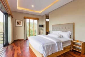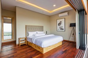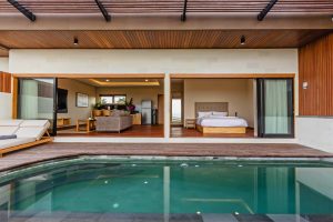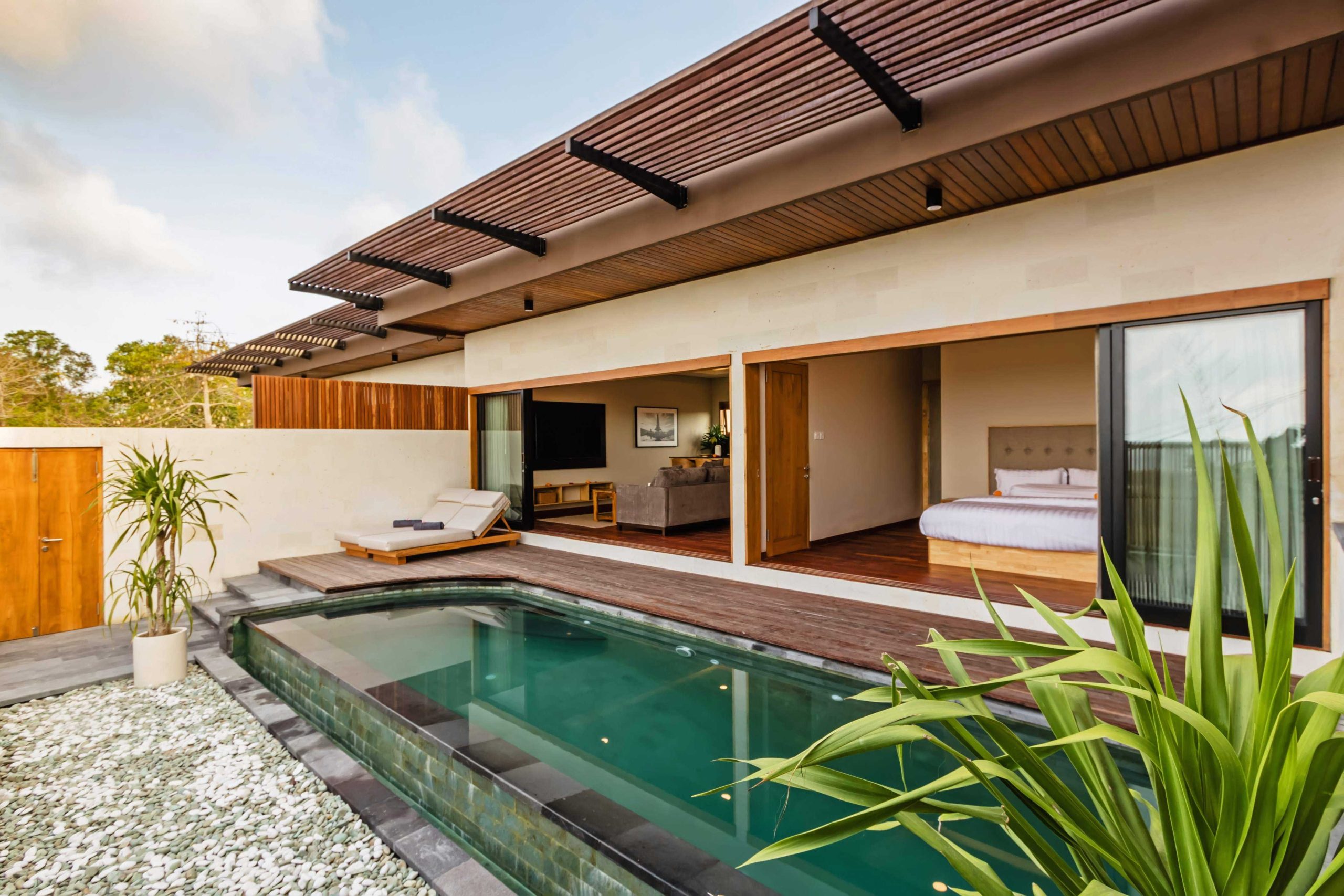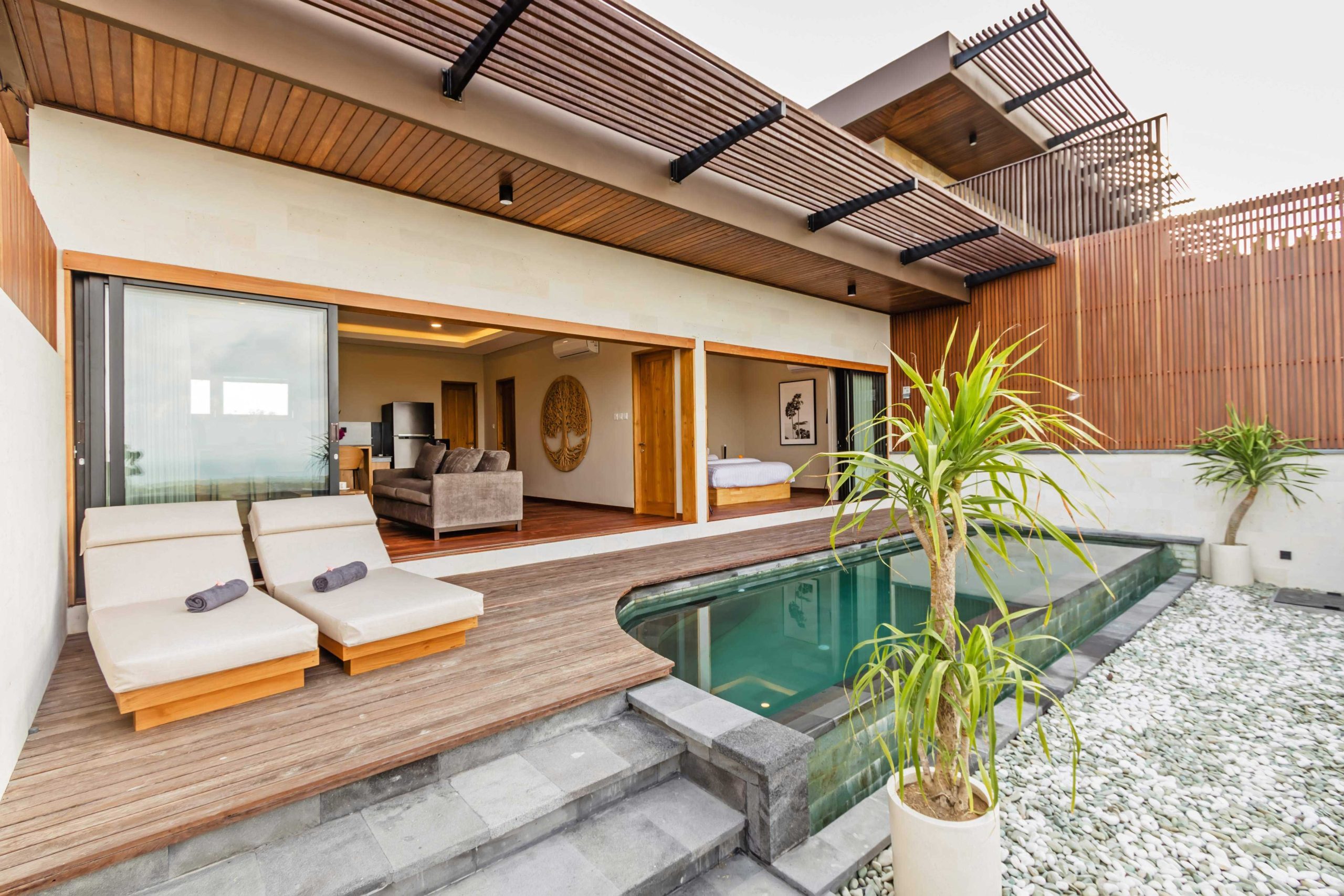 This spacious 1 and 2 bedroom private pool villa boasts a spacious bedroom with king size bed, ensuite bathroom and large living room and dining area. Outside you have your own private sun loungers, pool and pool deck area. Please note there is construction near us.